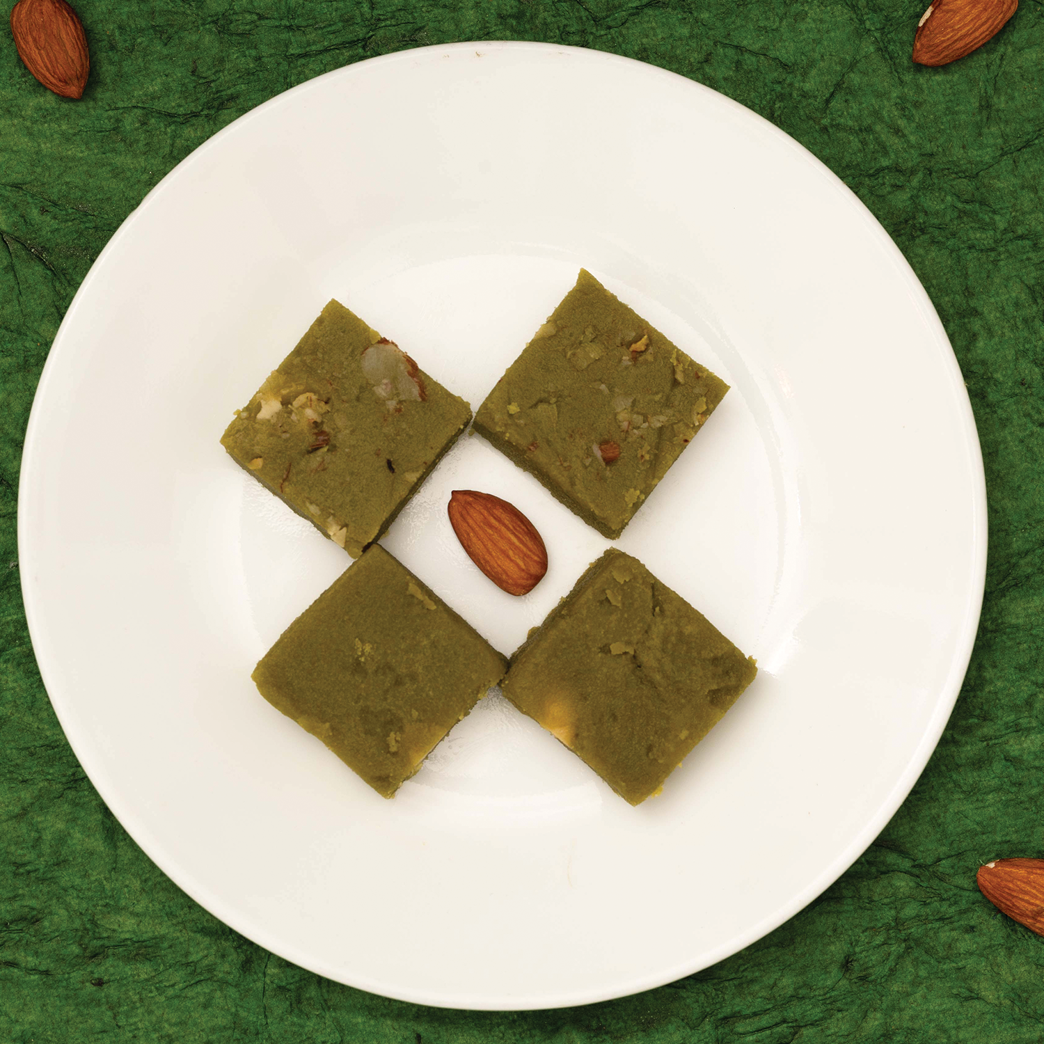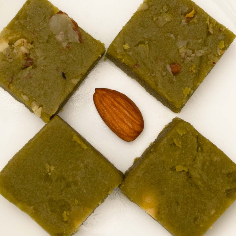 Mint Burfi is a refreshing sweet made from milk solids (khoya) and flavored with fresh mint leaves or mint essence.